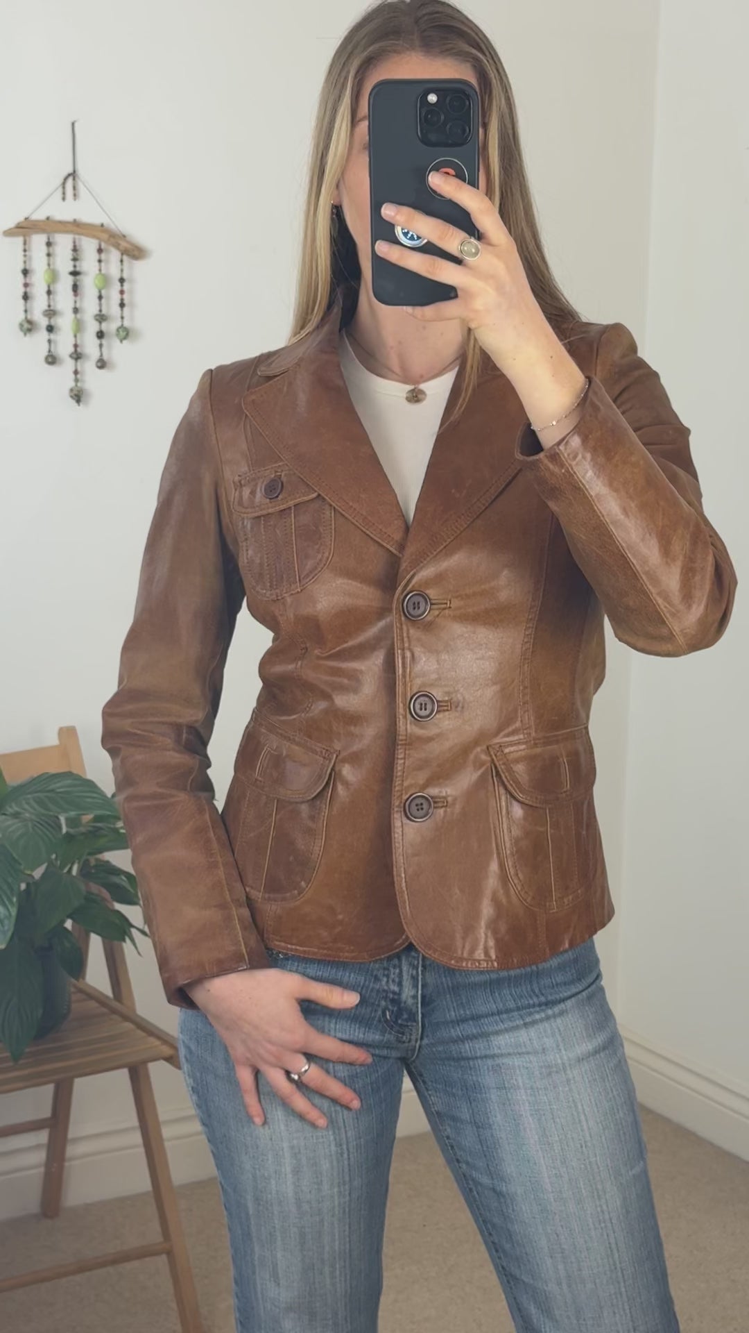 A true Y2K brown leather jacket, with 3 front buttons and two front pockets. Slim fitting, a lovely lovely piece.